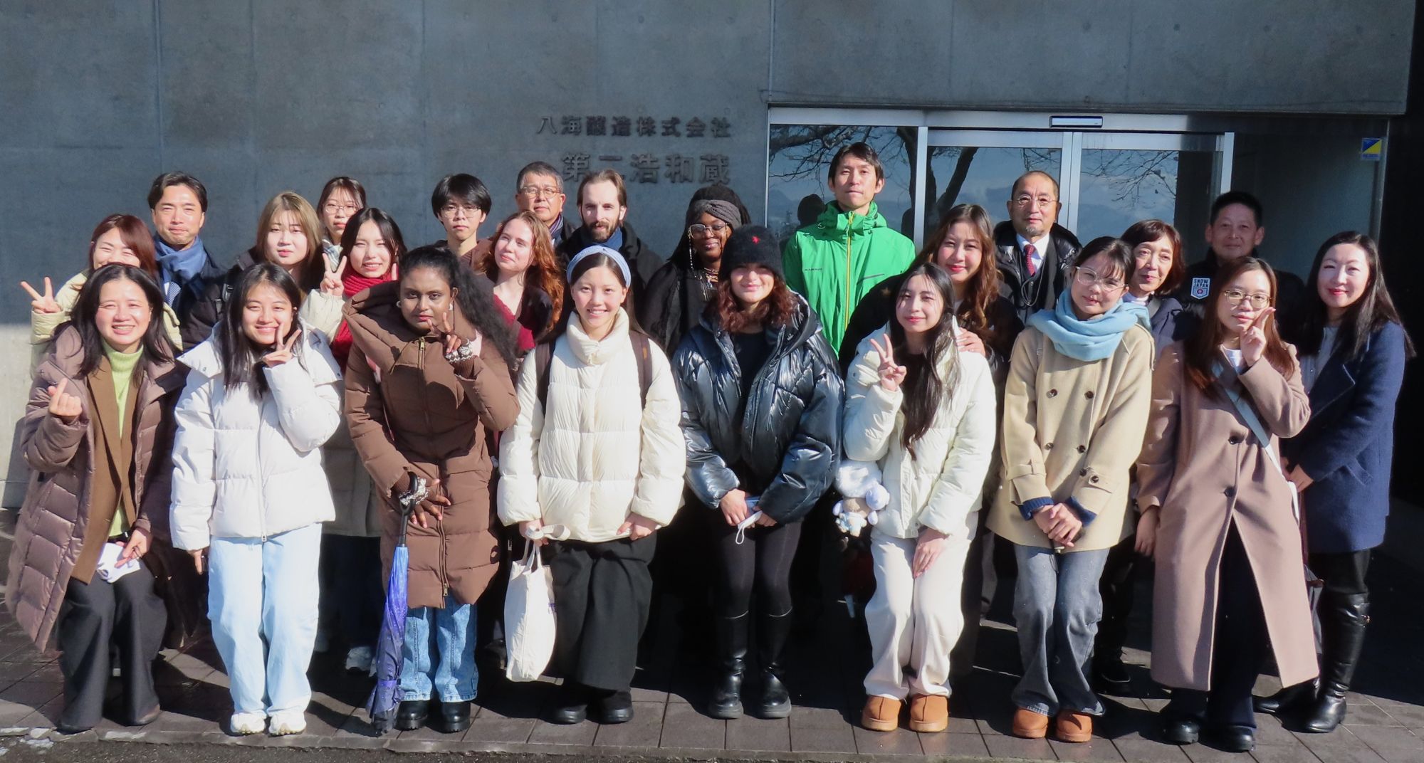 12月27日(土)、本学の学生15名が「魚沼の里」を訪問し、実践的なフィールドワークを体験しました。現地では、八海醸造株式会社 海外営業課の新井 志明課長をはじめ、グローバル人材戦略アドバイザーとして、森興産株式会社の森 隼人代表取締役社長と陳 麗部長、株式会社カンネツの荒木 努代表取締役社長と岡嶋 俊郎室長にもご参加いただきました。第一線で活躍される皆様の解説を受けながら、第二浩和蔵や雪室を視察。伝統を革新し続ける酒造りへの情熱と、世界を見据えた経営哲学に直接触れる、極めて密度の高い体験となりました。