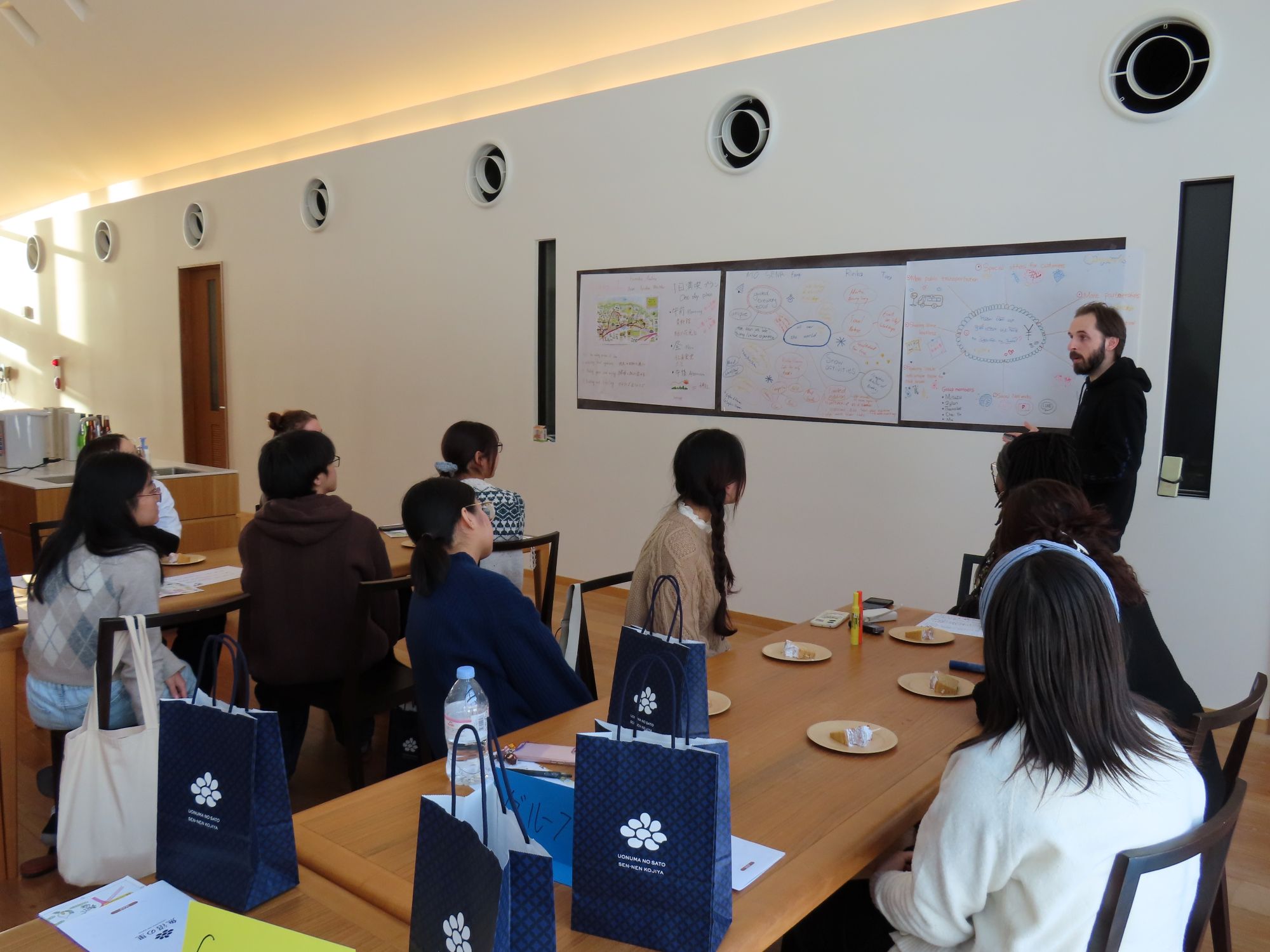 「魚沼の里」を舞台に開催された第2回ワークショップでは、インバウンド事業の拡大をテーマに、グローバルな視点と地域活性化の両立について建設的な議論が繰り広げられました。セッション後には、同社の誇る多彩な製品の試飲や「魚沼の里」の視察を通じて、地域の資源を五感で体感でき、理論と実践が交差する、極めて密度の高い学びと交流の機会となりました。また、教室での学びを地域の実践へと繋げる、本学ならではの貴重な共創の場となりました。