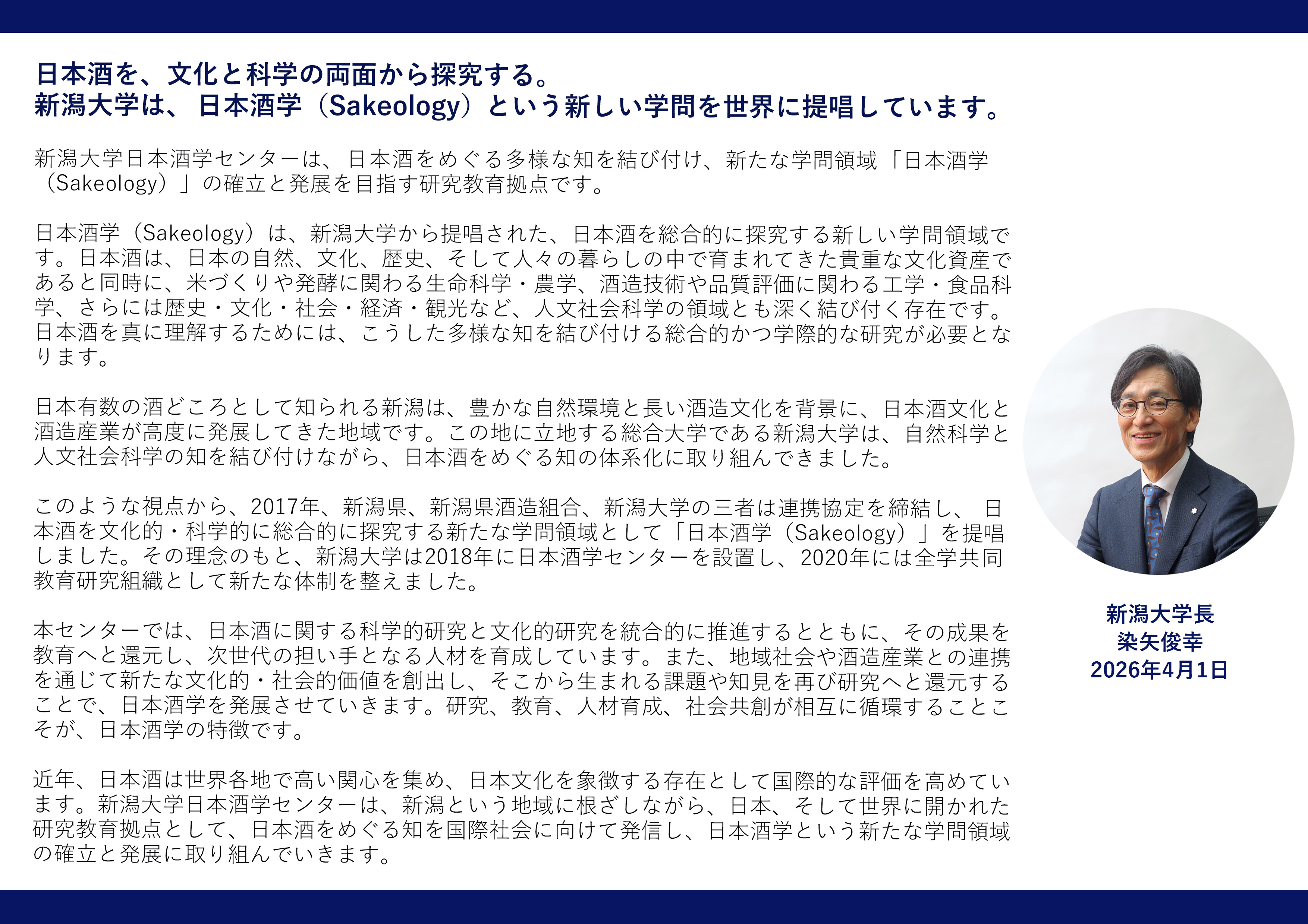 2026.04.01 トピックス 染矢俊幸新学長による日本酒学センターへのメッセージを掲載しました 2026年4月1日、いよいよ新年度がスタートしました。 このたび、2026年2月に第17代新潟大学長に就任した染矢俊幸学長より日本酒学センターに向けたメッセージをいただきました。日本酒学という新しい学問領域の学術的意義やその発展を担う新潟大学の役割について語ったメッセージです。ぜひご覧ください。 サイトの「日本酒学とは」のページに掲載しています。 ※ウェブサイトはこちら