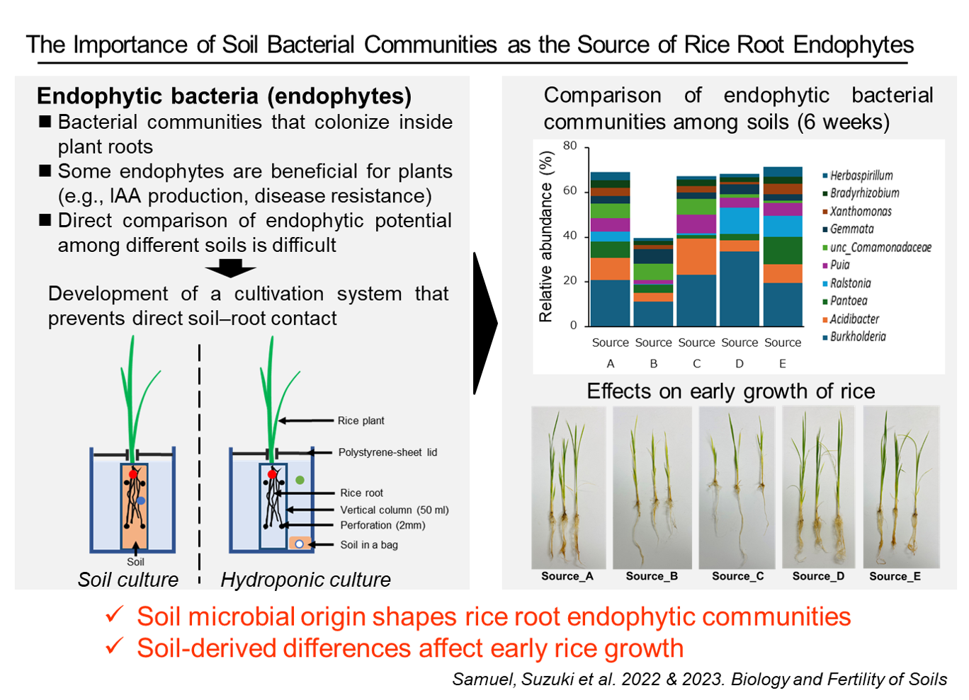 Dr. Suzuki explained that the bacterial communities in the rhizosphere differ from those in the surrounding soil and play a role in promoting plant growth. He introduced his research showing that the difference in soil type, rather than field management, had significant effects on the diversity of the bacterial communities using DNA metabarcoding. Furthermore, he demonstrated that soil differences lead to significant variation in the formation of endophytic bacterial communities in rice roots, thereby significantly affecting the early rice growth.